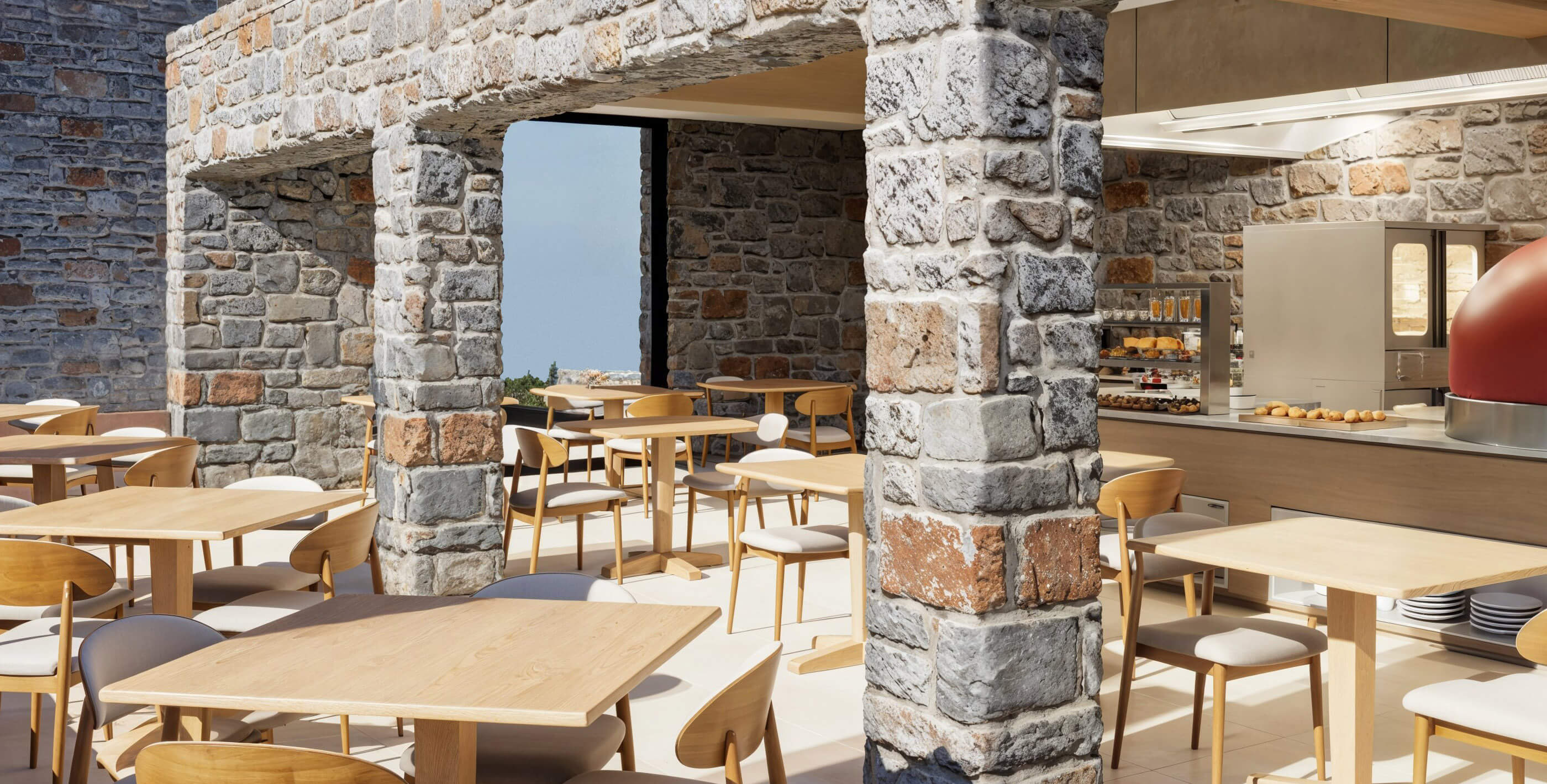 Πλούσιος μπουφές με φρέσκα τοπικά προϊόντα, παραδοσιακά εδέσματα και live corners (ομελέτες, κρέπες, λουκουμάδες).
